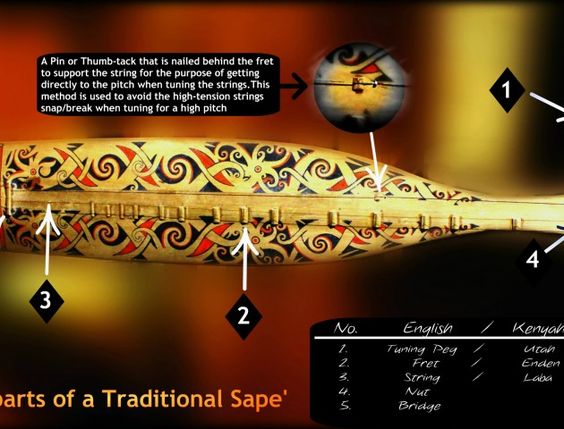 The parts of a traditional sape': Borneo, Culture art, High tension. Pinterest. (2021, July 3). https://www.pinterest.com/pin/321444492123185916/.
